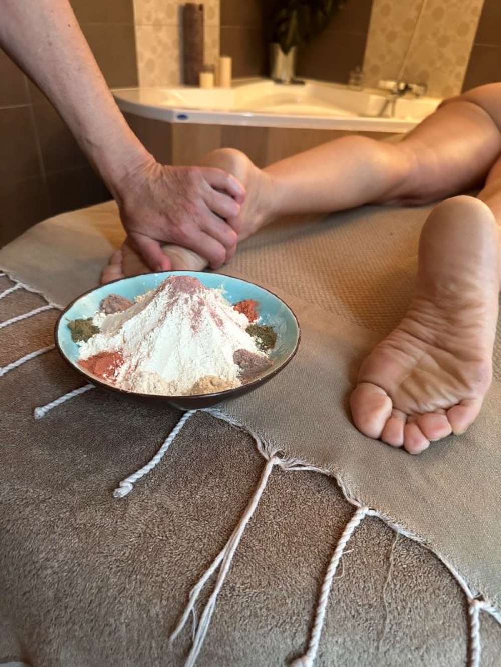 Nous commençons par massage superficiel et léger pour stimuler la lymphe et plus appuyé pour favoriser la circulation et libérer les tension. La poudre de pois chiches mélangée aux épices et aux plantes est ensuite saupoudrée en pluie. Les vigoureuses manœuvres (différentes frictions, balayages...) complètent les actifs des produits.