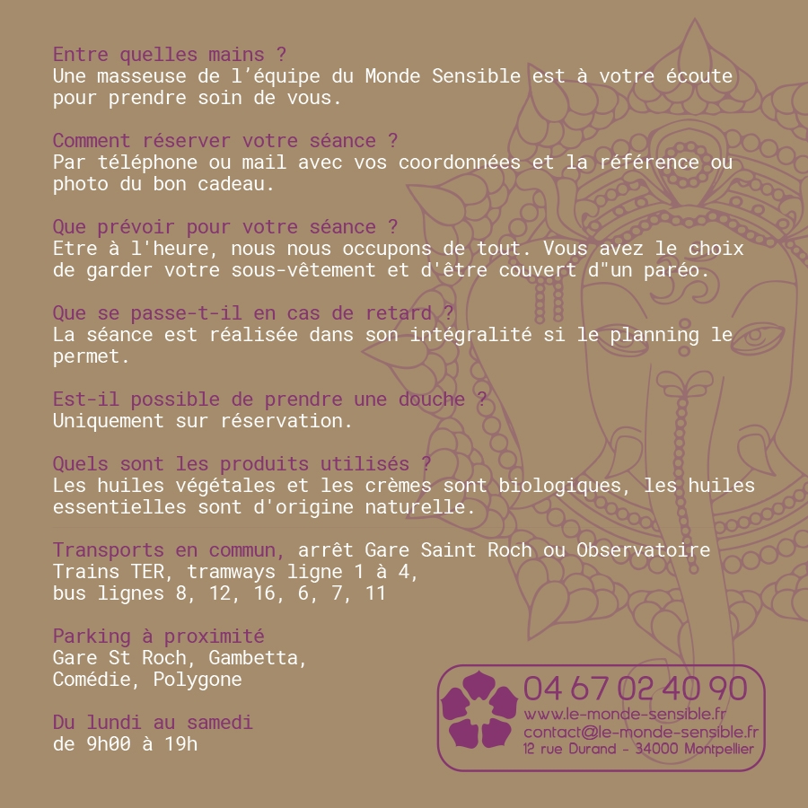 - Le masseur s'adapte aux besoins réels de la personne (tensions, besoin de douceur, énergie...)